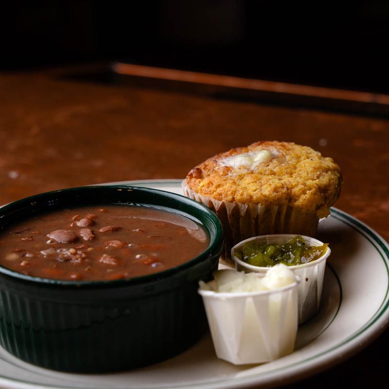 Pinto beans slow-cooked in traditional Kentucky style with onions and ham. Served with relish, onions, and a corn mash muffin made from spent barrel house grains